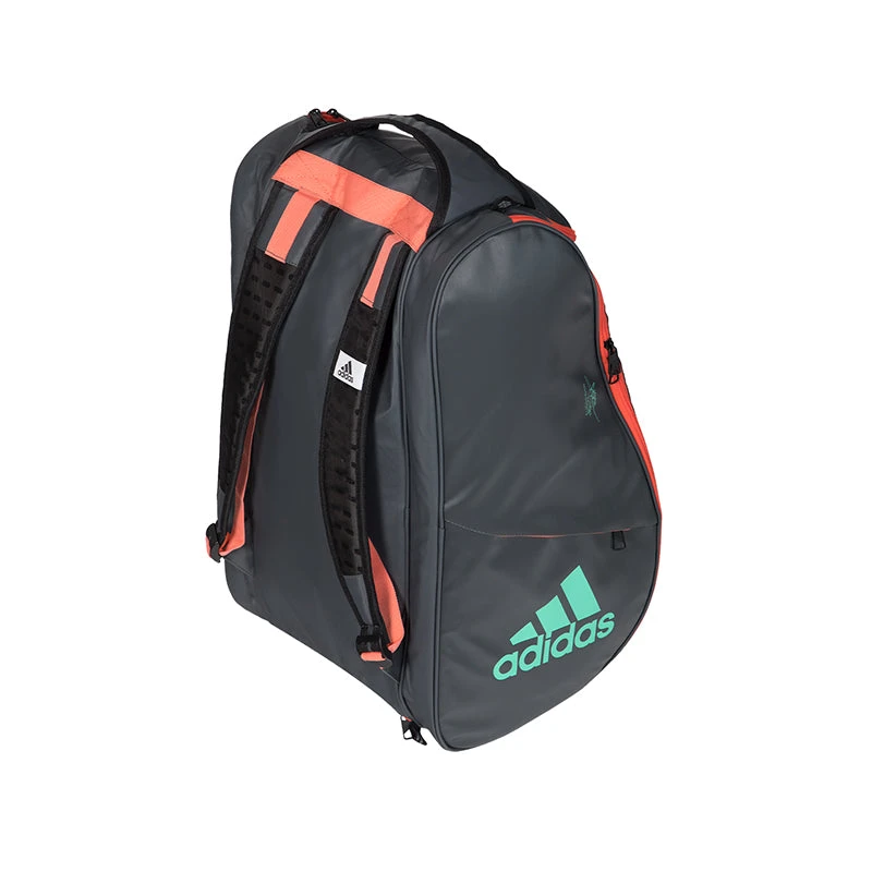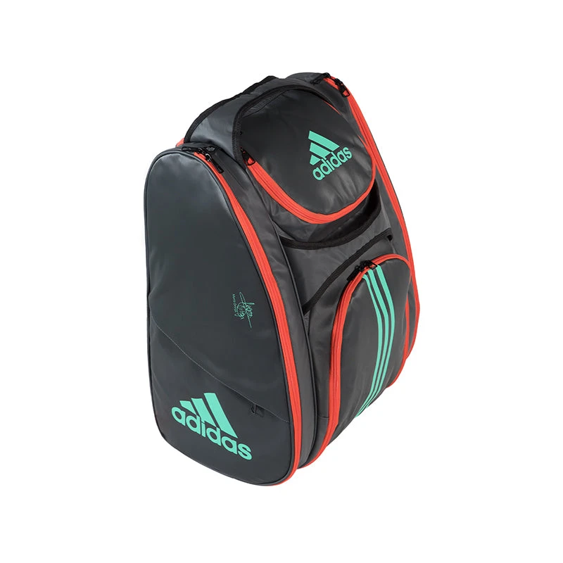 The new adidas Padel Multigame Racketbag has a felt-lined pocket located at the top to hold your valubles, two thermal side compartments and a large central compartment with ventilation to store your shoes. Can hold up to 9 padel frames.