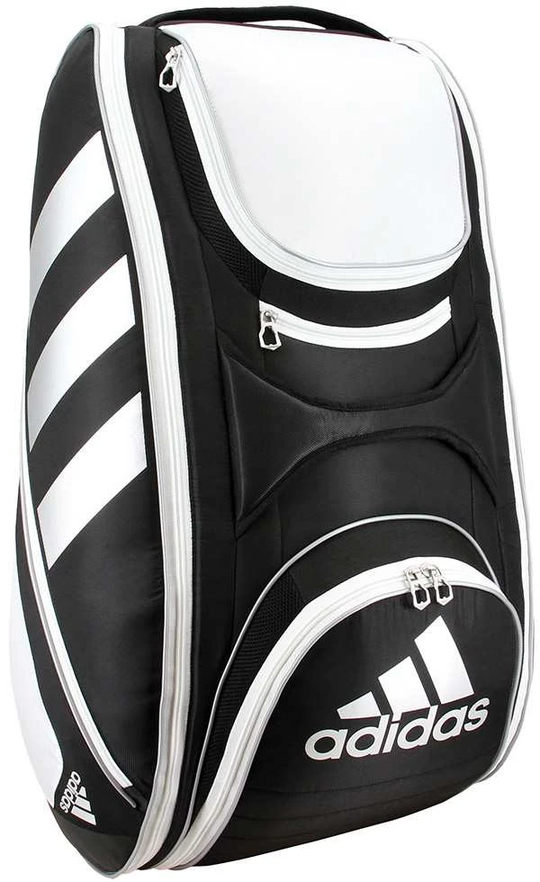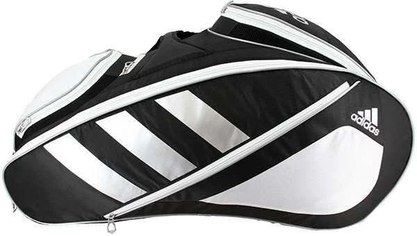 Carry all your gear to the court with the sporty adidas Tour Tennis 12 Pack Racquet bag. With loads of storage space, this bag has two large insulated racquet compartments that hold up to three racquets each. The top tricot-lined media pocket keeps your cell phone and MP3 player safe, and at the same time provides easy access. The middle compartment can be used to hold more racquets or additional gear. Featuring a large separate and ventilated freshPAK compartment on top ideal for carrying shoes or dirty gear. The bag also features one outside accessory pocket and an internal mesh pocket to ensure that your things are right where you need them to be. The Ultraride padded shoulder straps and back panel make carrying this bag simple. Adidas brandmark screen printed on the top and both sides of the bag.