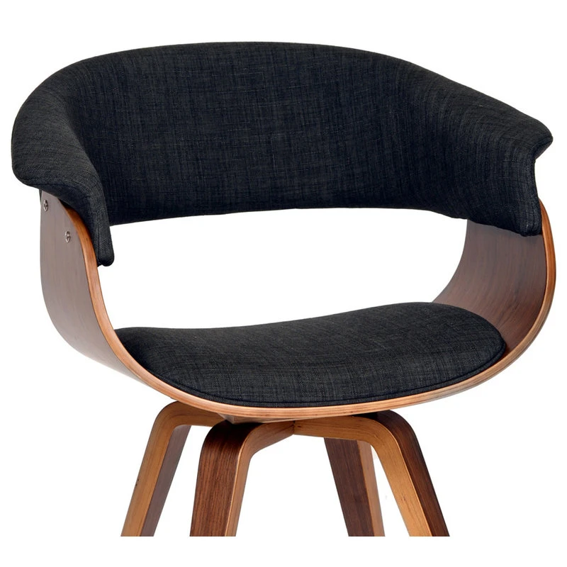 Mid-century modern inspiration and quality materials come together harmoniously with the Summer Dining Room Chair in Fabric and Wood from Armen Living. The Summer dining chairs are available in multiple color finishes and add a touch of style to any home. Use them traditionally as dining room chairs, add to the living or bedroom as an accent chair, or utilize in your home office or gaming room. The modern dining chairs are constructed from poplar wood, which has relatively high density, compressive strength, and bending strength compared to other woods. The polyester upholstery is resistant to stains, mildew, abrasion, and sunlight. The seat height of the Summer dining chairs is 19″ and it easily pairs with a dining table between 28″-30″ high. Mid-Century Modern design style was developed from the organic architecture principles of Frank Lloyd Wright, combined with elements drawn from the Bauhaus movement – the center of modernism. Characterized by clean simplicity, Mid-Century Modern style is organic in its use of wood and other natural materials. Enjoy smooth, ergonomic comfort with the Summer dining chair’s curved seat and backrest that hugs your back, melting away the cares of the outside world as you settle in for a coffee or extended meal. The Summer dining room chairs are available in your choice of a black wood finish with charcoal or grey upholstery, or a walnut wood finish with green, charcoal, or blue upholstery.