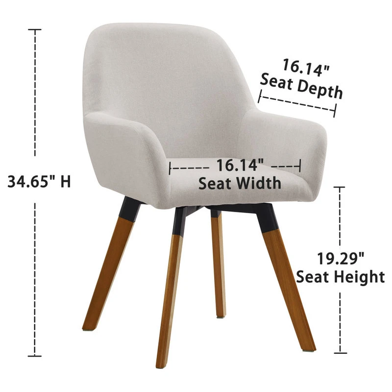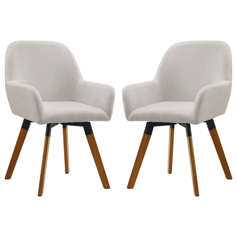 Bring a touch of mid-century modern vibe to your dining room or kitchen with this set of 2 dining chairs. Featuring soft Linen upholstery bucket-shaped seat with high-density foam padding, these kitchen chairs offer you a comfortable seat to relax or lounge. Solid splayed Beech legs with a natural finish add extra durability and sturdiness. The swivel seat can spin 360 degrees ensuring easy mobility. Blend classic elegant clean-lined design and practical function to your living room, dining room, home office, vanity, or bedroom with these armed dining chairs for extra cozy seating.