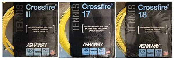 Ashaway Crossfire is a powerful hybrid with 100% braided and bonded Aramid mains and Synthetic Gut crosses. Crossfire 16g: This string is recommended for power players with heavy top spin or chronic breakage problems. (Recommended tension for mains 45-65 lbs/crosses 50-70 lbs.) Crossfire 17g: This string is recommended for power players who are willing to sacrifice some durability for better playability and ball control. The 17 gauge enhances the feel and spin control while slightly reducing durability. Recommended for chronic string breakers only when durability is not their primary concern. (Recommended tension for mains 45-60 lbs/crosses 50-65 lbs.) Crossfire 18g:Â