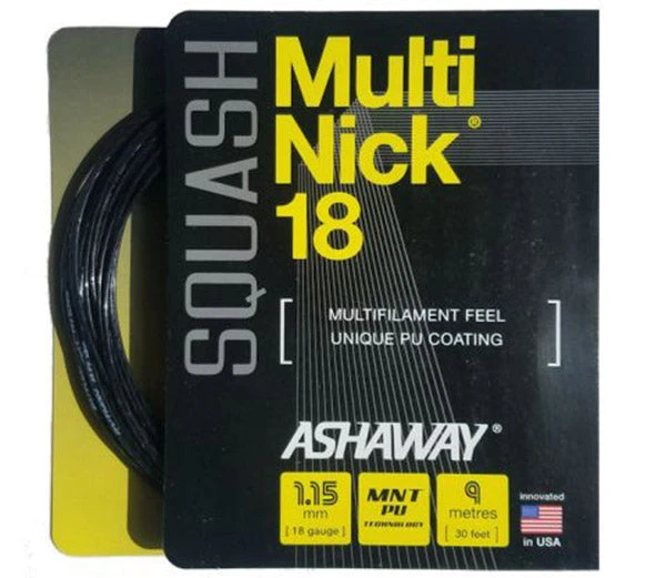 Ashaway MultiNick 18 combines high tenacity multifilament nylon filaments with a unique polyurethane resin coating. Delivers enhanced feel and ball control with multifilament construction. For feel, durability and toughness at all levels of play. The 18 gauge maximizes ability to cut and spin the ball.