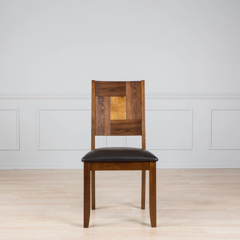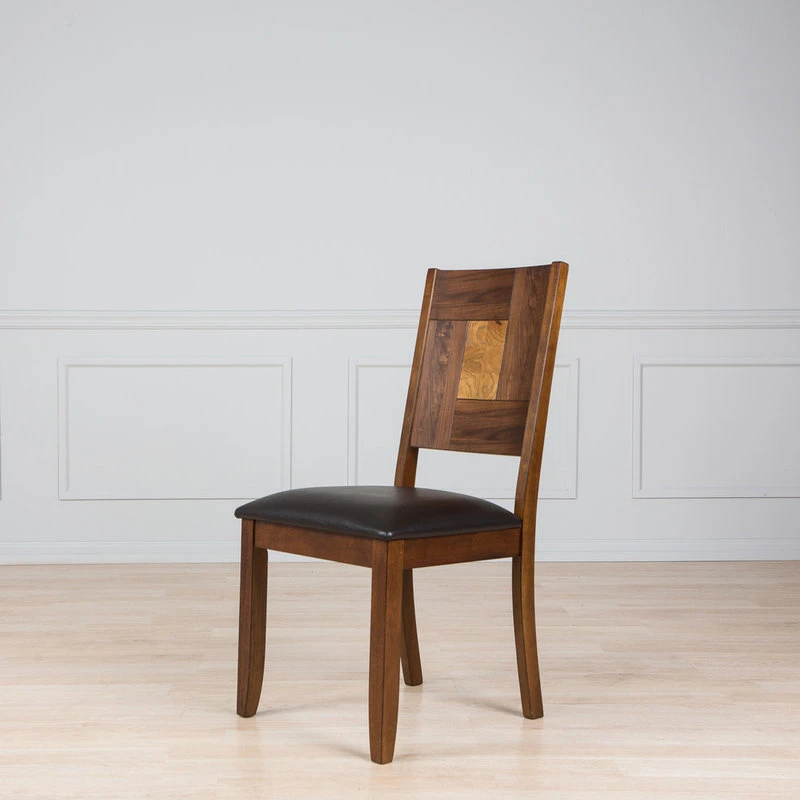 This classic design chair combines both style and comfort. Crafted from sturdy hardwood with a lovely walnut finish, the chair features a square solid back with straight legs and rungs. This casual and modern chair is perfect for entertaining your guests and family at dinner time.