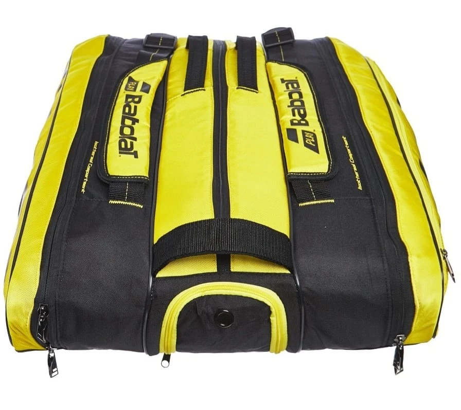 The Babolat Pure 12 Pack Tennis Bag in Yellow and Black holds up to 12 racquets, making it perfect for competitive players. The bag features three compartments, two of which are insulated to maintain string tension. There are new, bigger openings for better access, plus a pocket with a hard shell to protect fragile accessories. Backpack straps offer ease of carry. This bag comes in yellow and black to match the 2019 Pure Aero racquet line.