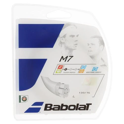 Babolat M7 Tennis String is a new, innovative string with a multifilament construction that provides power, comfort and durability. The string is made up of seven 100% polyamide monofilaments and an innovative PA+PU matrix that provides a longer lifespan and a high level of comfort. Get multifliament comfort with improved durability with Babolat M7 String! Players should expect a more crisp response than Babolat;s popular Xcel string line. If you are looking for comfort but more control, M7 is made for you. Construction: 100% Polyamide Monofilament and PA + PU Matrix Length: 40′ Gauge: 1.30mm (16G) or 1.25mm (17G) Color: Natural Features: -Comprised of 7 monofilaments -Crisp Controlled Multifilament -Soft but responsive feel -Increased durability compared to most multi-filament strings