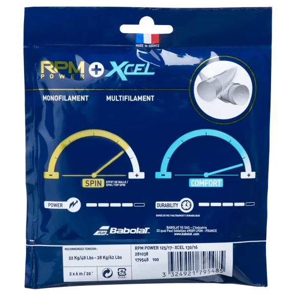 RPM Power + XCEL brings spin, power, durability, and feel to your game. Whether you’re playing with polyester and looking for more power and feel or you want more spin and durability but don’t want to use a full bed of polyester: this hybrid combination is a must try. Made in France.