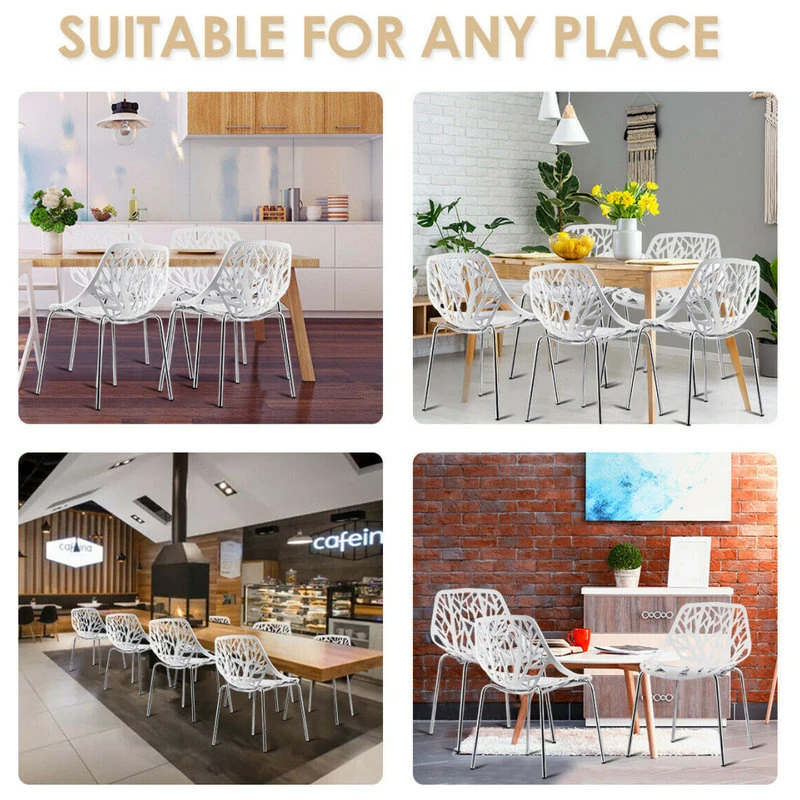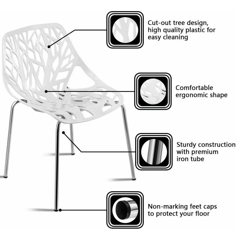 This is our high quality birch sapling chair set. Premium metal construction keeps them last longer, and the beautiful cut-out tree design makes your place more fashionable. It is perfect for Indoor and outdoor use. 4 plastic feet can protect your floor from scraping. Stackable and compact design for space saving storage. 6 in 1 set at great price. Don’t hesitate to put them in your cart!