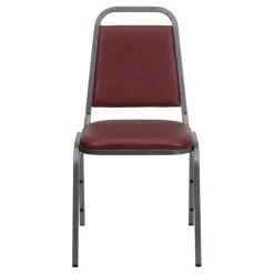 Organize events for any occasion with banquet chairs, these stylish ballroom chairs are the right choice for casual and formal events. Built for the commercial industry these trapezoidal back banquet chairs have been tested to hold up to 500 pounds. With a high seating capacity these stack chairs are perfect for the event rental business. This standout hospitality chair can be used as is and still command attention or be dressed up for formal events by placing a chair cover over it. The chair is cushioned with 1.5″ thick CAL 117 fire retardant foam and is covered in a durable, easy to clean vinyl upholstery. The sturdy frame with gracefully angled legs are made of 16 gauge steel in a lasting powder coated finish. Double support braces reinforce the frame to give it great strength and durability. Bumper guards prevent scratches on the frame when stacked (up to 10 high) and non-marring floor glides protect your floor by sliding smoothly when you need to move the chair. This multi-use stacking upholstered stack chair is an excellent option for churches, banquet halls, training rooms, hotels, convention centers and schools. Add banquet chairs to your home dining table to add a contrasting look to your dining room or kitchen.