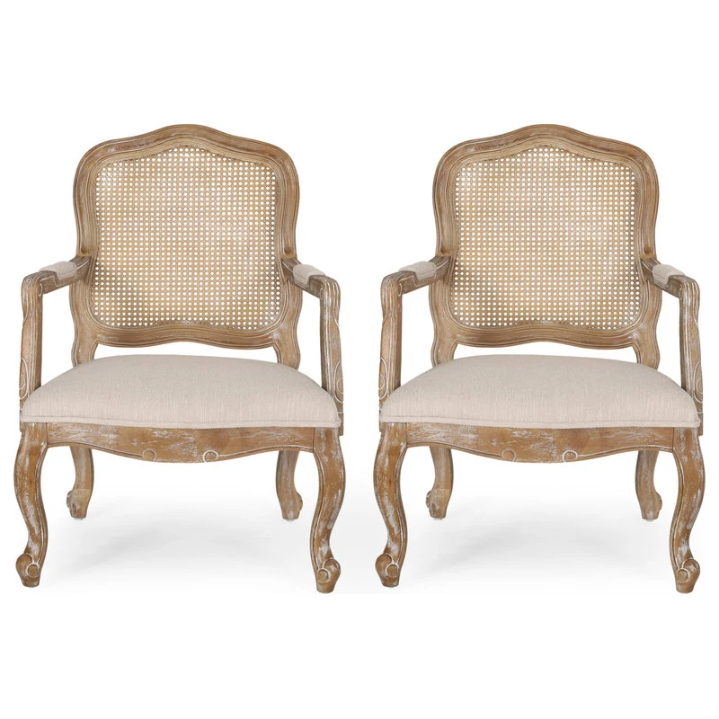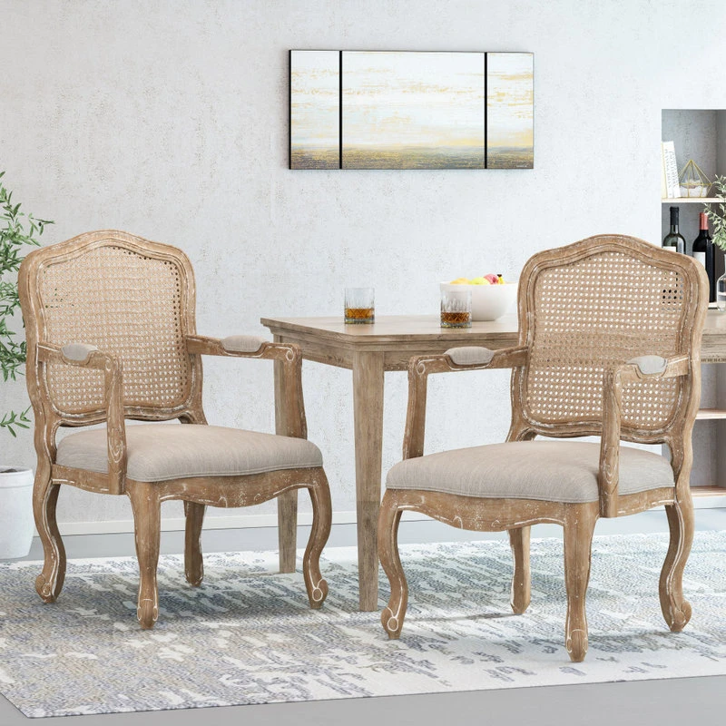 Cozy yet sophisticated, complete your dining set with the perfect seating. Drawing from French country inspiration for a rustic country atmosphere, our set of upholstered dining chairs feature an Old World styled backrest with a cane finish, graceful cabriole legs, and exquisite armrests to offer your home something a little out of the ordinary while also remaining true to their elegant, old-fashioned roots. Their weathered frames showcase wonderfully contrasting lines and curves that encourage both casual meals with your family or extravagant dinner parties with your guests.