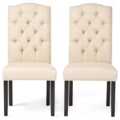 Update your dining room with these exquisite, upholstered dining chairs. With a tufted seat back and crown-shaped top, these are perfect for every manner of occasion: formal enough for a serious dinner, but relaxed enough for casual, daily use. Their neutral tones will complement almost any room, allowing you diverse options for table setting and wall decoration. Made from the highest-quality materials by trained craftspeople, these are built from durable materials to the highest specifications. These are building blocks for the dining room of your dreams. Let your inner interior decorator get to work right away!
