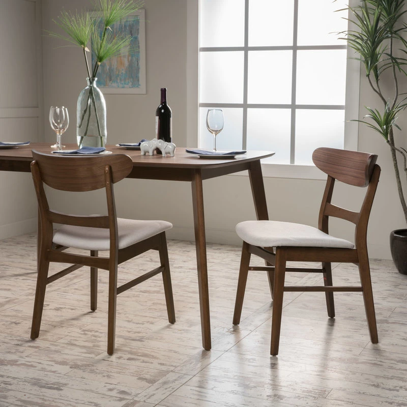 Mid-century modern design makes a stylish appearance in your dining room with these lovely dining chairs. These striking chairs feature soft, upholstered seats and beautifully-finished wood frames. Stunning curves and splayed legs bring even more intrigue and depth to the chic aesthetic. The combination of textures and colors adds dimension to any well-edited space. Fill your dining room with retro charm by pairing these bold and unique chairs with an equally charming dining table, a bold rug, and a coordinating sideboard.