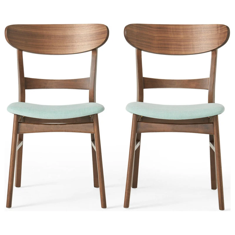 Mid-century modern design makes a stylish appearance in your dining room with these lovely dining chairs. These striking chairs feature soft, upholstered seats and beautifully-finished wood frames. Stunning curves and splayed legs bring even more intrigue and depth to the chic aesthetic. The combination of textures and colors adds dimension to any well-edited space. Fill your dining room with retro charm by pairing these bold and unique chairs with an equally charming dining table, a bold rug, and a coordinating sideboard.