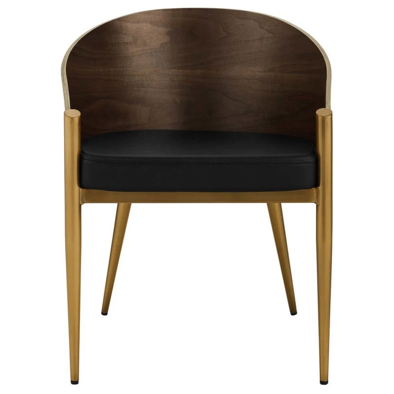 Imbue your dining room with the chic, organic design of the Cooper Dining Armchair. Sit stylishly on a dense foam padded seat upholstered in quality faux leather while dining, relaxing, and entertaining. Resting atop tapered gold metal legs with non-marking black plastic foot caps, Cooper features a curved bentwood seat back with a beautiful walnut grain veneer. A contemporary update to a dining room, living room, bedroom or entryway, this dining armchair balances mid-century charm with contemporary style for a look that complements a variety of decors. Dining Chair Weight Capacity: 331 lbs.