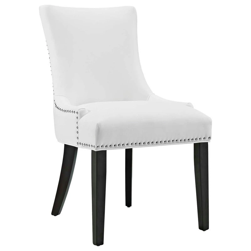 Bequeath distinction with the Marquis Dining Chair. Charm and elegance adorn this luxurious button tufted dining chair complete with sleek curves and antique copper nailhead trim. Featuring dense foam padding, fine vinyl upholstery, solid wood frame, and non-marking foot glides, Marquis is an elegant dining chair perfect for the modern home.