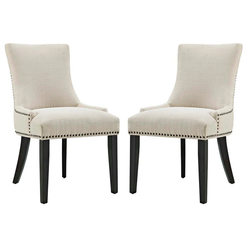 Inspire your decor with the Marquis Dining Side Chair. Marquis is fashioned with a chic hourglass shaped back, studded nailhead trim, non-marking foot caps, tapered wood legs, and a regal seat generously padded in foam and upholstered in polyester fabric. Marquis works well in both modern and traditional dining rooms.