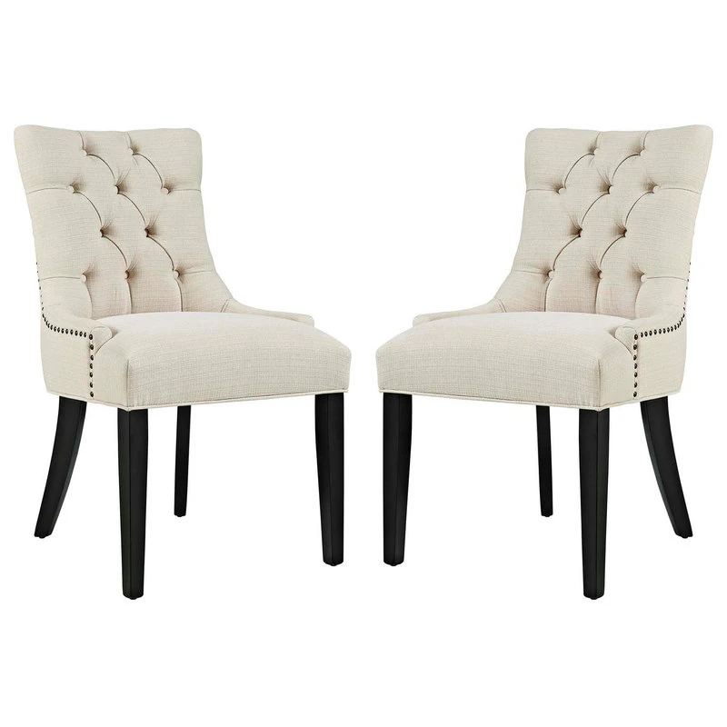 Transport your decor to a simpler time with the Regent Dining Side Chair. Fashioned with a chic and elegant look, Regent features finely tufted buttons, studded nailhead trim, and a regal seat generously padded in foam and upholstered in polyester fabric. Regent comes with non-marking foot caps, tapered wood legs, and works well in both modern and traditional dining rooms.