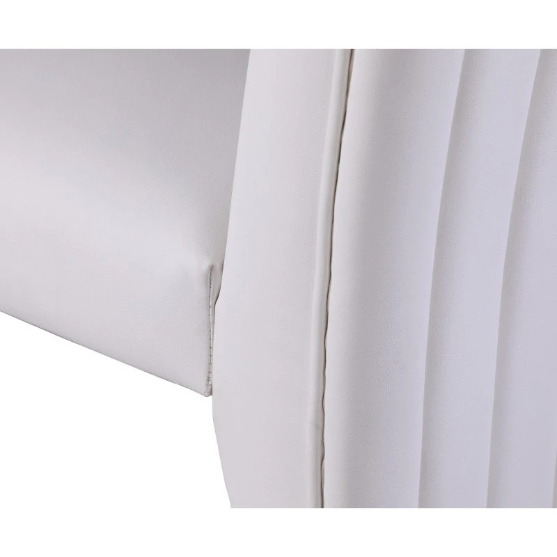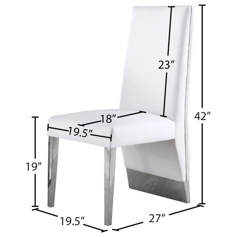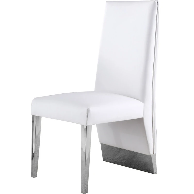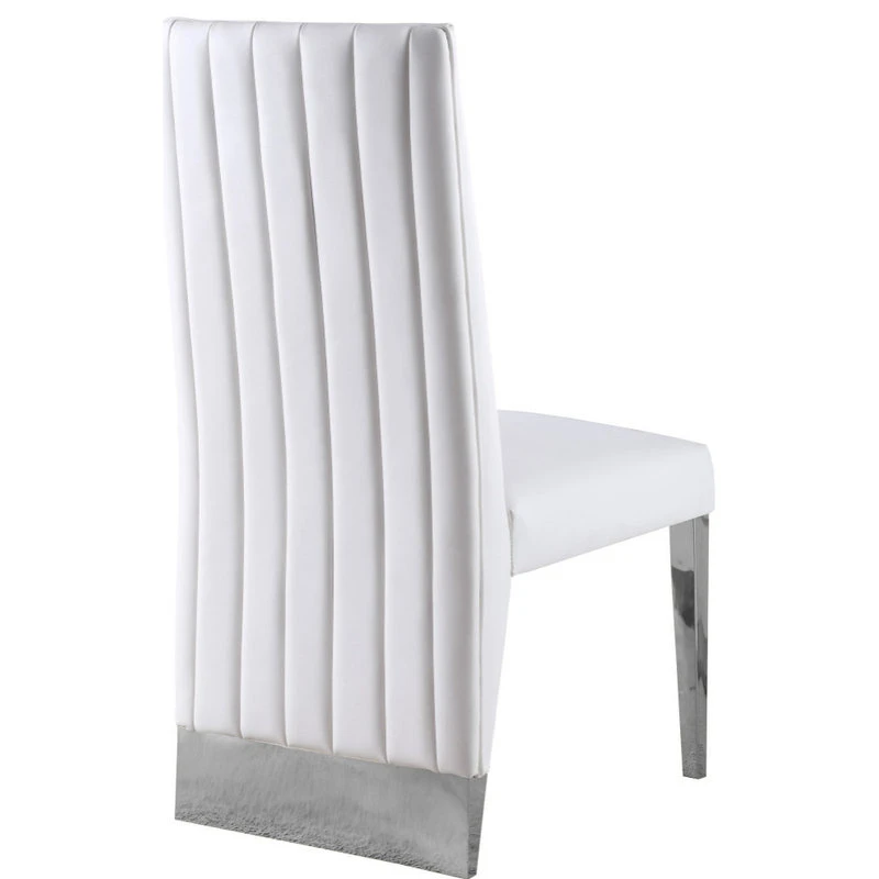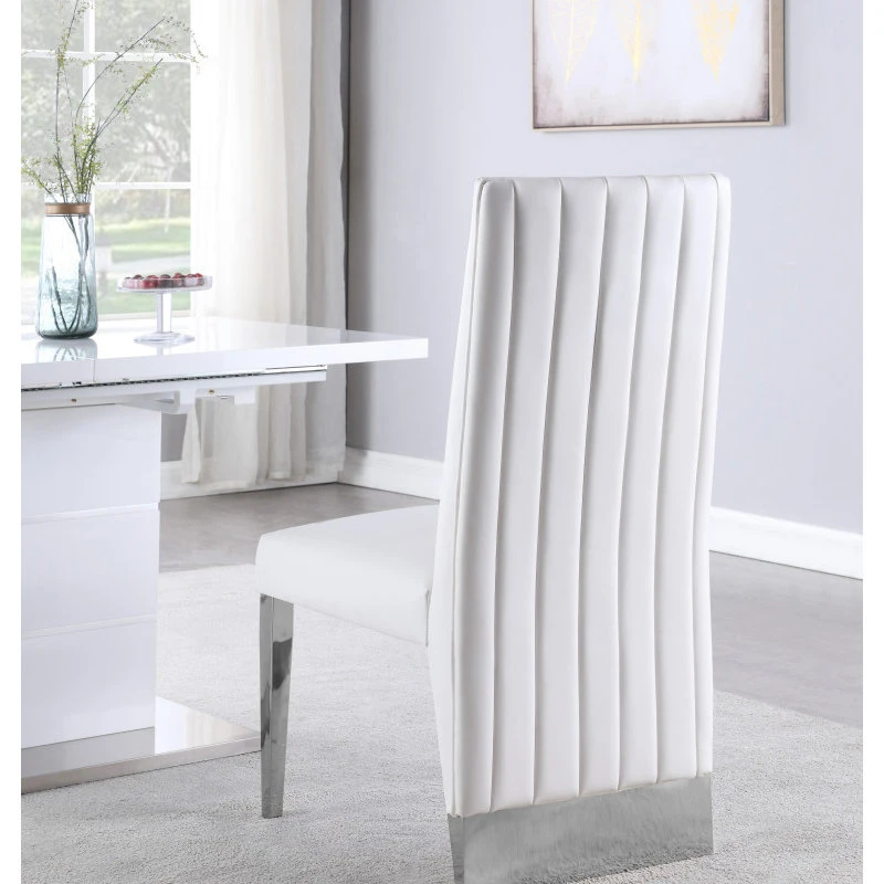 Bring the luxe look of this Porsha chair to your dining space. Impressing guests is simple when they’re seated in this chair. The floor-length back is elegantly beautiful and creates a striking silhouette from every angle. Faux Leather upholstery material in a sophisticated hue of white adds a touch of modernity to this chair, and the reverse is channel tufted for added elegance and refinement. Chrome legs complete the look for added contemporary panache and sturdy support.