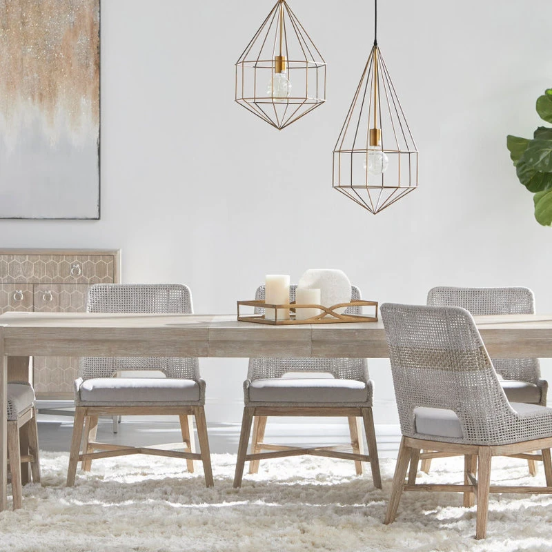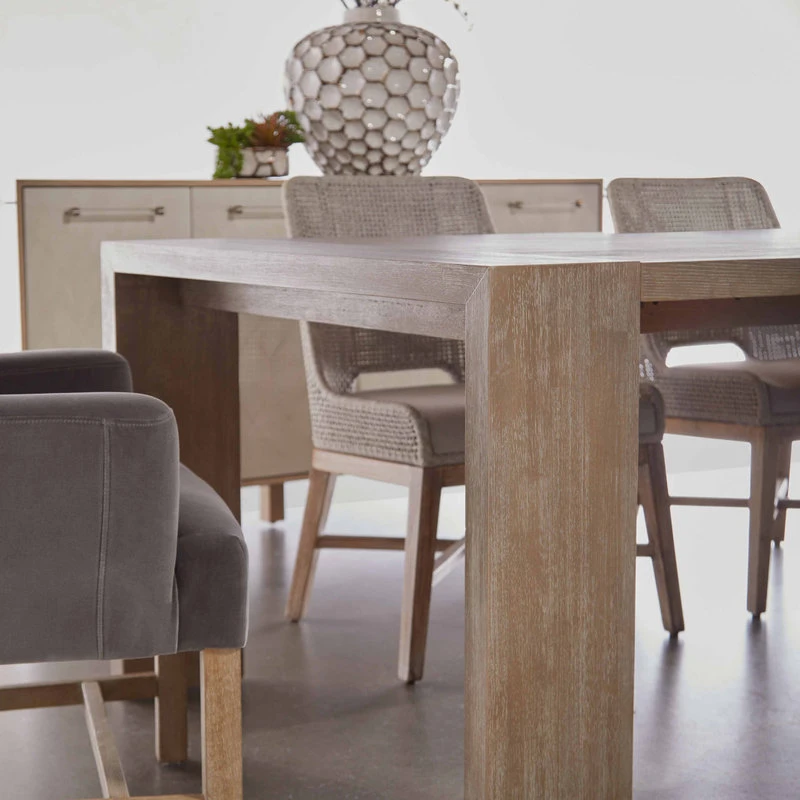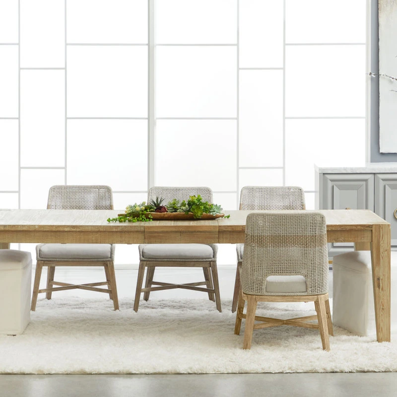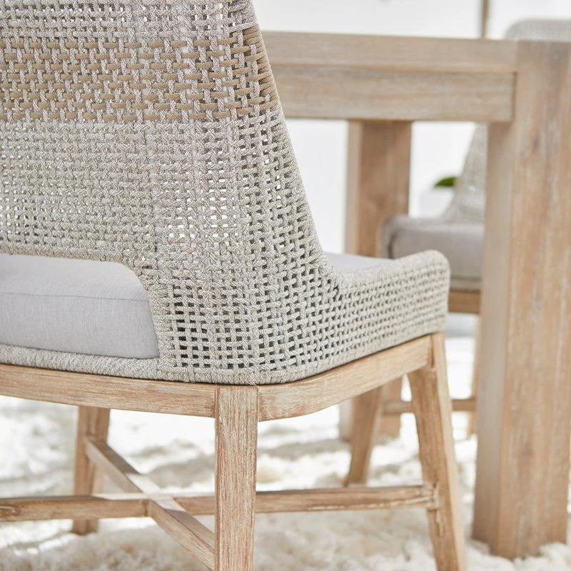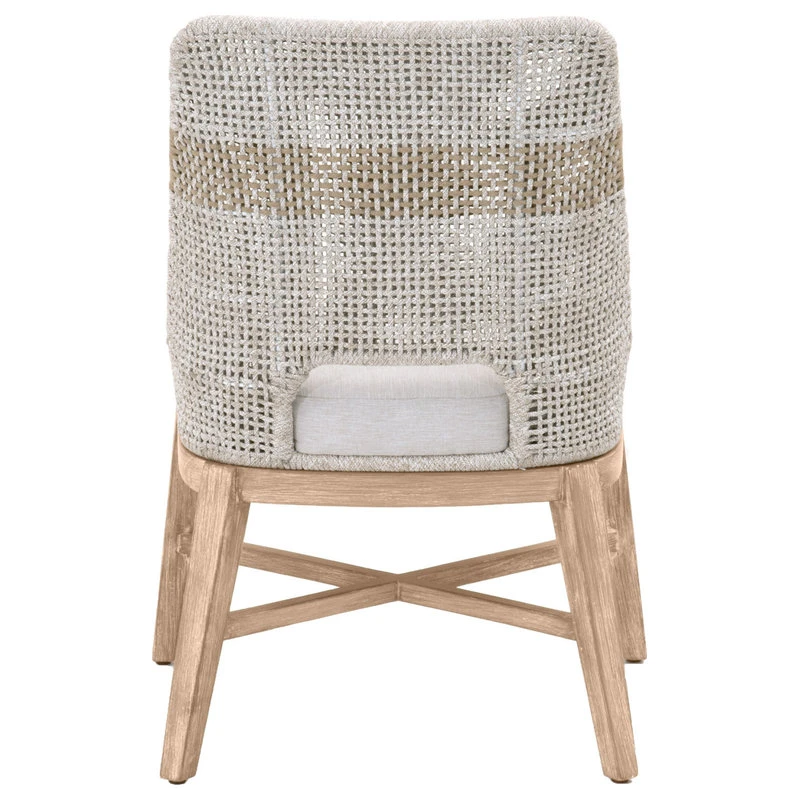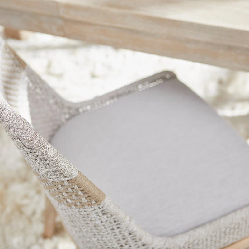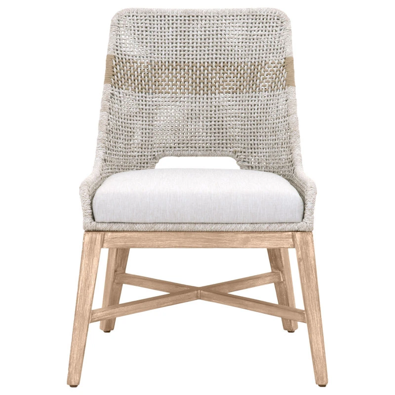Transitional style dining chair featuring solid Mahogany frame, an interwoven Taupe & White Flat Rope design, and Pumice Fabric
