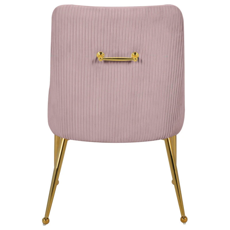 SKU: 855Pink Category: Dining Chairs Tags: Comfortable, Contemporary, Elegant, Furniture, Matching handle on back, Modern, Pink velvet dining chair, Pleated fabric on back, Polished gold legs with ball design