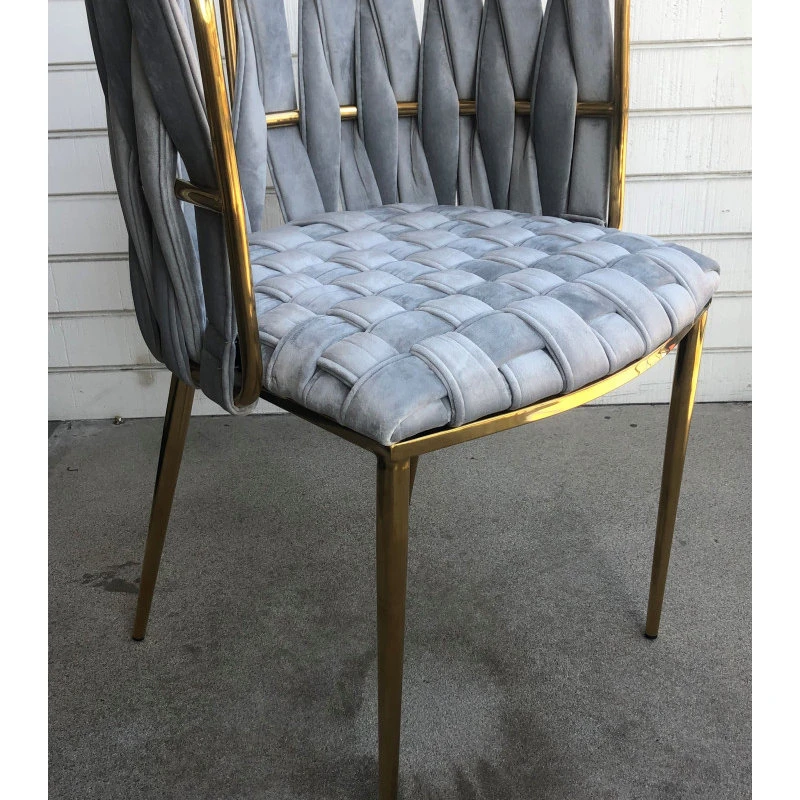 - Weaved gray velvet fabric and gold steel legs create this dining chair with a sleek design