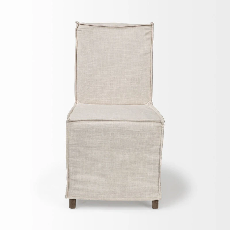 Beautiful dining chair that will elevate your dining area. They feature a four-legged, light-brown toned wooden frame with a perfectly cushioned, seat and backrest. What makes this chair stand out is the plush, cream-toned fabric that covers the seat and backrest which extends to cover the four legs. The fabric covering hides most of the wooden accents on the chair, making it look like an all fabric piece. With soft cream fabric tones, the chair looks fabulous in spaces based on the Enduring Elegance or Coastal design styles