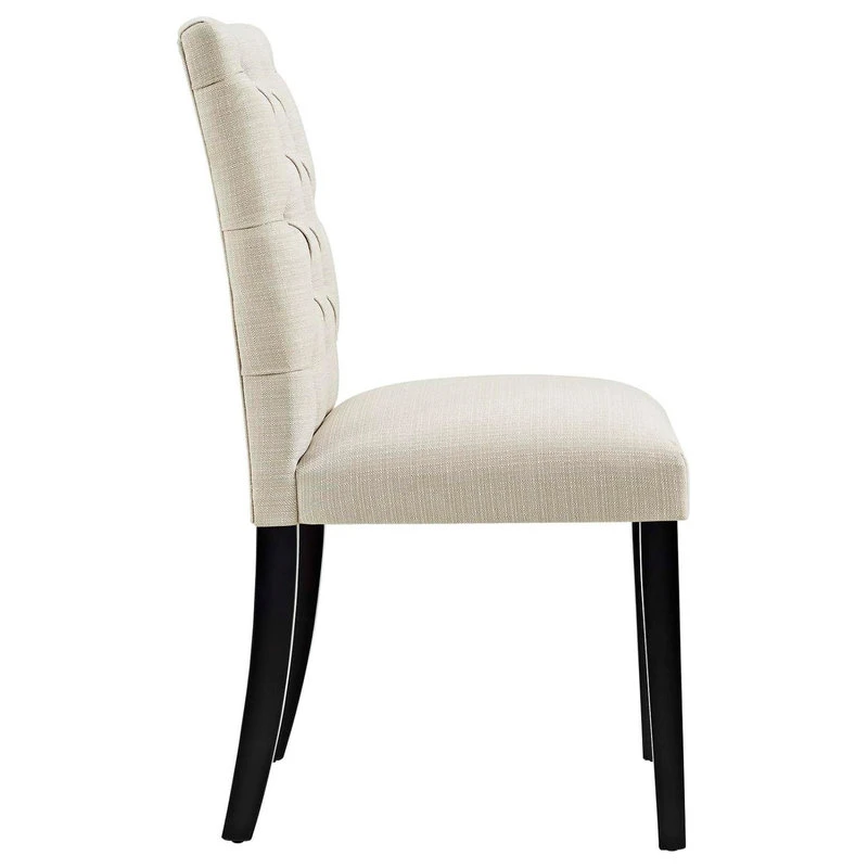 Bestow elegance with the Duchess Dining Chair. Chic and luxurious, Duchess features a stylish curvy form, richly tufted button back, dense foam padding, fine fabric upholstery, and wood legs topped with non-marking foot caps. Resonate grace and charm with a dining chair perfect for the modern home.