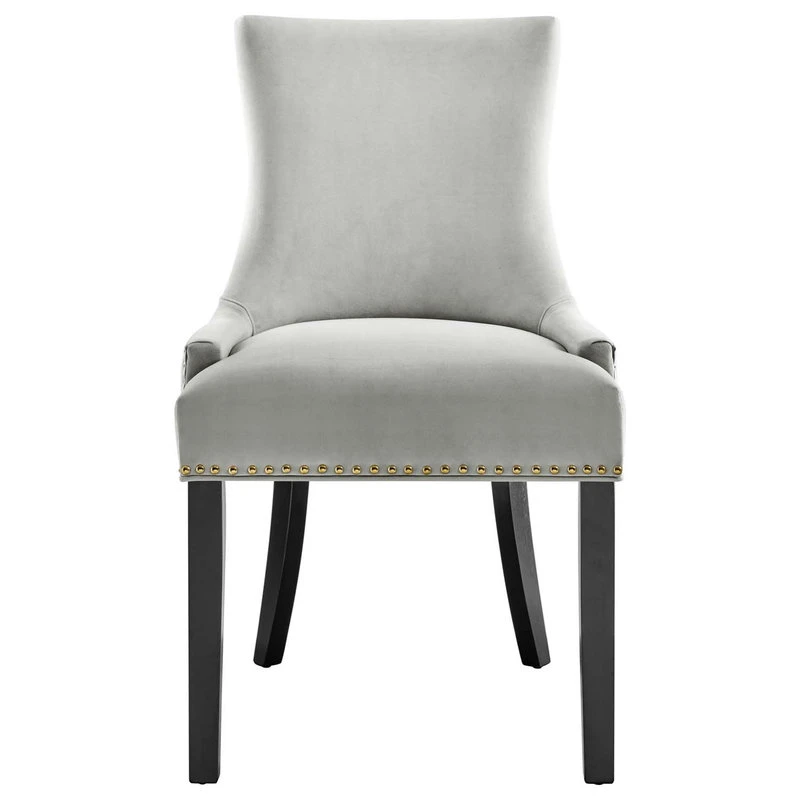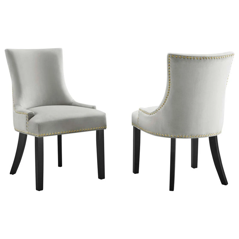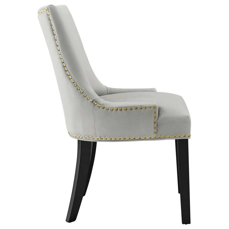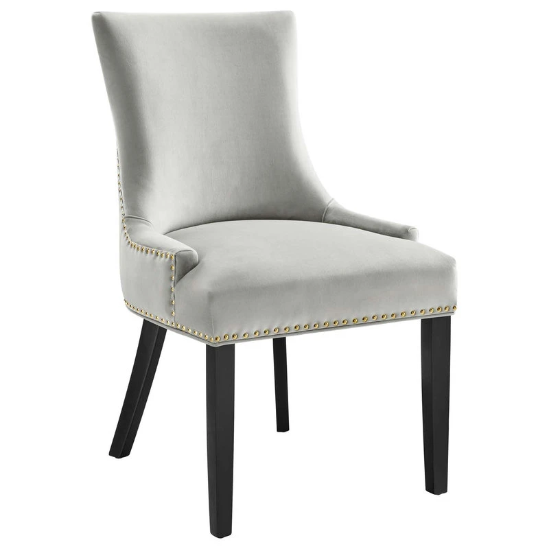 Inspire your decor with the Marquis Dining Side Chairs – Set of 2. Marquis is fashioned with a chic hourglass shaped back, studded nailhead trim, non-marking foot caps, tapered wood legs, and a regal seat generously padded in foam and upholstered in stain-resistant performance velvet fabric. With a sinuous spring support system for a premium seating experience, Marquis works well in both modern and traditional dining rooms.