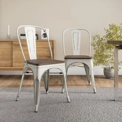 Belleze Wood Seat Metal Dining Chairs, Set Of 4, Antique White