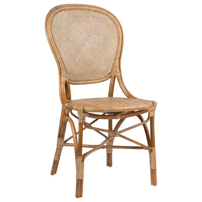 The Rossini Side Chair by Sika Design is an intricately woven rattan design that continues to be a favorite in private homes and cafes. A handcrafted design that dates back to the 1960s, the natural rattan bistro chair is an eye-pleasing blend of shapes and textures. An arched round back showcases an airy crossover weave, with a masterfully handwoven herringbone seat adding comfort to the poetic midcentury design. Combined with the Rossini Armchair, the side chair brings undeniable appeal to indoor dining spaces.