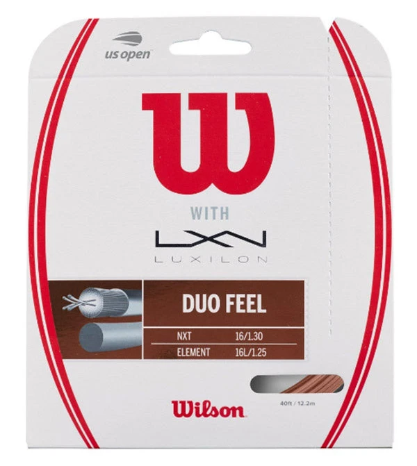 Wilson’s Duo Feel is a hybrid string that blends NXT with Luxilon Element for excellent shock absorption and less string bed vibration. For ideal playability, reduce tension on Luxilon Element at least 10%. Either string can be installed in the mains for superior feel and performance.