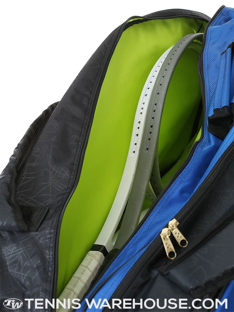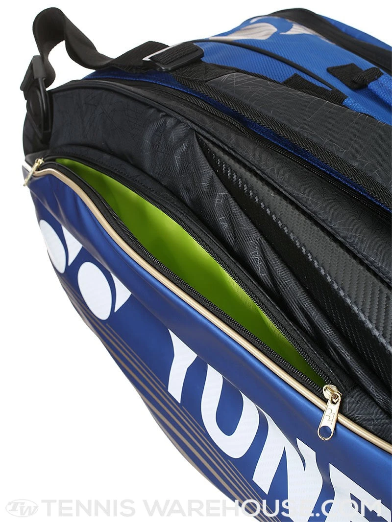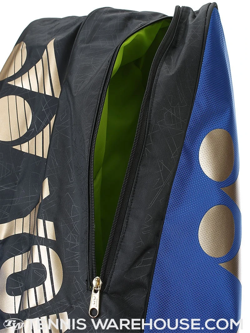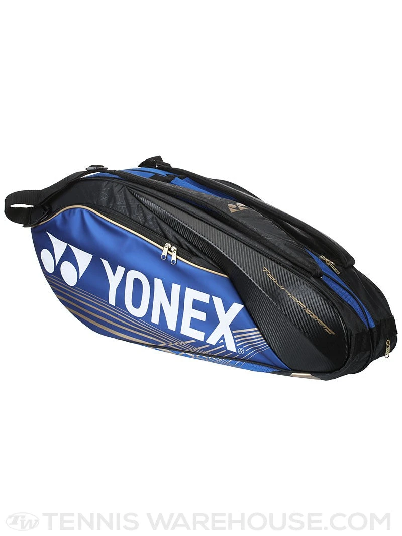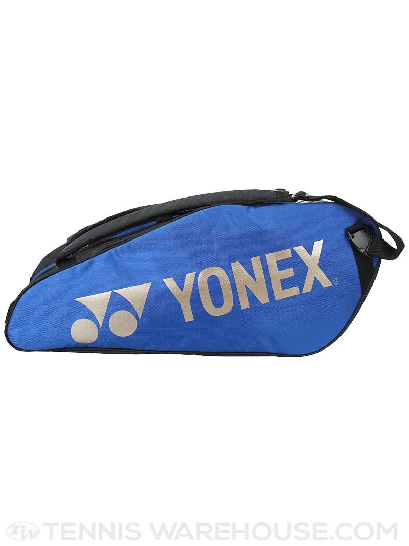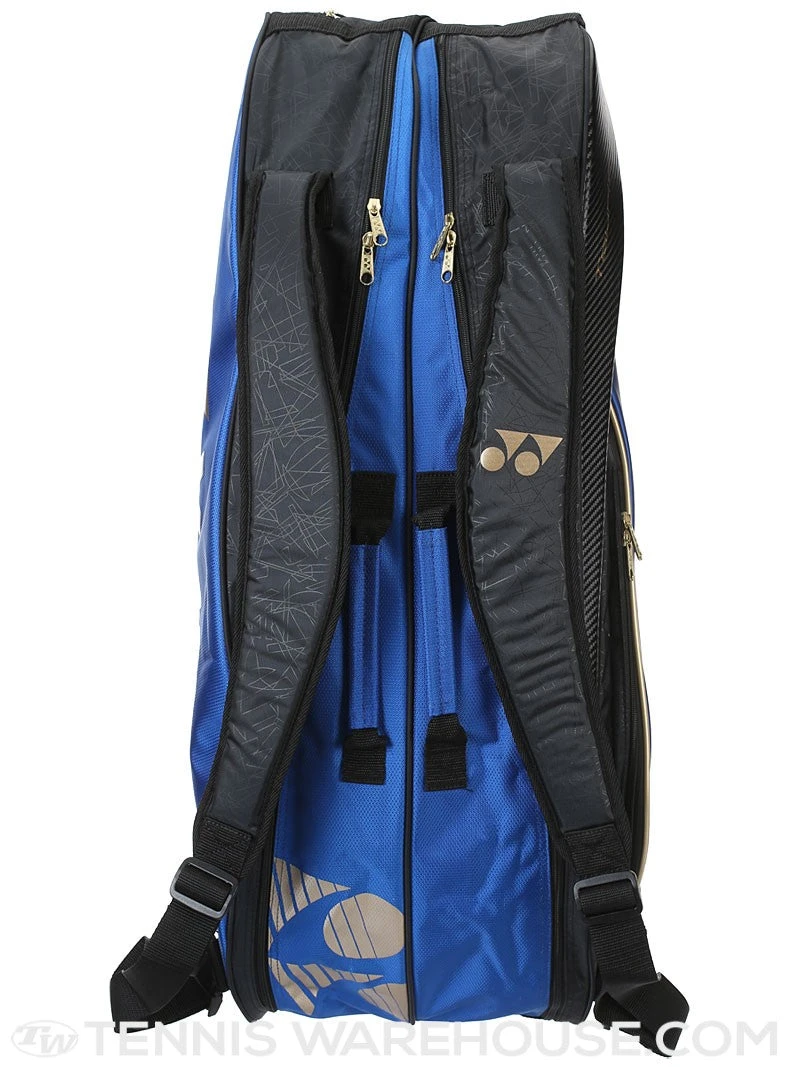 The Yonex Pro Series 6 Pack Bag is a great heavy duty option for the player looking to carry up to 6 racquets to the courts. Two large main compartments are ideal for carrying all your racquets or any extra gear. A zippered accessory pocket on the side helps keep your personal items organized and easy to get to. A separate pocket on the bottom of the bag that expands into one of the main compartments is perfect for carrying your tennis shoes or dirty clothes. The heavy duty design is re-enforced by a new semi-molded outer shell that helps the bag keep its shape and hold up to the rigors of travel. Dimensions: L31″ x W11″ x H13″ Two large main compartments can hold up to 6 racquets or extra gear. A zippered accessory pocket on the side keeps your personal items organized and easy to access. Another accessory pocket on the bottom of the bag expands into one of the main compartments is great for holding your tennis shoes or dirty clothes. Two padded, adjustable straps can be used as backpack straps for easy and comfortable carrying. Color: Blue / Black / White / Gold